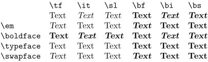 \starttabulate[|l|f{\tf}l|f{\it}l|f{\sl}l|f{\bf}l|f{\bi}l|f{\bs}l|] \NC \NC \tttf \tex{tf} \NC \tttf \tex{it} \NC \tttf \tex{sl} \NC \tttf \tex{bf} \NC \tttf \tex{bi} \NC \tttf \tex{bs} \NC\NR \NC \NC Text \NC Text \NC Text \NC Text \NC Text \NC Text \NC\NR \NC \tex{em} \NC \em Text \NC \em Text \NC \em Text \NC \em Text \NC \em Text \NC \em Text \NC\NR \NC \tex{boldface} \NC \boldface Text \NC \boldface Text \NC \boldface Text \NC \boldface Text \NC \boldface Text \NC \boldface Text \NC\NR \NC \tex{typeface} \NC \typeface Text \NC \typeface Text \NC \typeface Text \NC \typeface Text \NC \typeface Text \NC \typeface Text \NC\NR \NC \tex{swapface} \NC \swapface Text \NC \swapface Text \NC \swapface Text \NC \swapface Text \NC \swapface Text \NC \swapface Text \NC\NR \stoptabulate