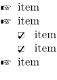 \usesymbols[mvs] \definesymbol[1][{\symbol[martinvogel 2][PointingHand]}] \definesymbol[2][{\symbol[martinvogel 2][CheckedBox]}] \startitemize[packed] \item item \item item \startitemize[packed] \item item \item item \stopitemize \item item \stopitemize