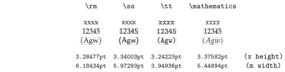 - 7 \showfontstrip : the current typeface combination, with roman, sans, math, and teletype families visualised, with x-heights and m widths.
