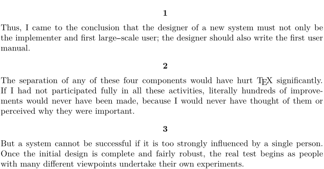 \setupwhitespace[big] % Create a new counter \definecounter[parnum][way=bytext] % Give the number some distance from the paragraph \def\deepstrut{\vrule width 0pt depth 2ex} % Will be typeset on every paragraph \def\NumberParagraph{ \incrementcounter[parnum] \midaligned{ \bf \rawcountervalue[parnum] \deepstrut } } \EveryPar{\NumberParagraph} \input knuth