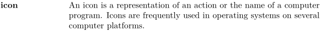 \definedescription[description][location=top,headstyle=bold] \description{icon} An icon is a representation of an action or the name of a computer program. Icons are frequently used in operating systems on several computer platforms. \par