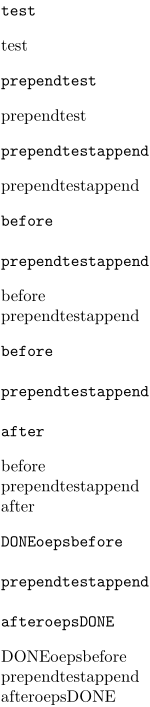 \startbuffer[test] test \stopbuffer \startbuffer[oeps] oeps \stopbuffer \typebuffer[test] \getbuffer[test] \startbuffer[test = * + test] prepend \stopbuffer \typebuffer[test] \getbuffer[test] \startbuffer[test = test + *] append \stopbuffer \typebuffer[test] \getbuffer[test] \startbuffer[test = * +++ test] before \stopbuffer \typebuffer[test] \getbuffer[test] \startbuffer[test = test +++ *] after \stopbuffer \typebuffer[test] \getbuffer[test] \startbuffer[test = * + oeps + test + oeps + * ] DONE \stopbuffer \typebuffer[test] \getbuffer[test]