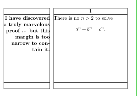 \setuppapersize[A8,landscape][A8,landscape] \setuplayout[leftmargin=2.5cm, leftmargindistance=0.2cm, backspace=2.9cm, width=4cm, rightmargin=0cm] \showframe \starttext \margintext{I have discovered a truly marvelous proof ... but this margin is too narrow to contain it.} There is no \math{n > 2} to solve \startformula a^n + b^n = c^n. \stopformula \stoptext