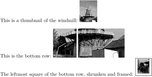 % Tell ConTeXt where to find the windmill picture \setupexternalfigures[location={default}] % \setupclipping[nx=3,ny=3] This is a thumbnail of the windmill: \externalfigure[mill][width=1cm] \blank[line] This is the bottom row: \hbox{% \clip[x=1, y=3]{\externalfigure[mill]} % <-- space between clips \clip[x=2, y=3]{\externalfigure[mill]}% <-- no space between clips \clip[x=3, y=3]{\externalfigure[mill]} } The leftmost square of the bottom row, shrunken and framed: \framed{ \scale[sx=0.5,sy=0.5]{\clip[x=1, y=3]{\externalfigure[mill]}} }