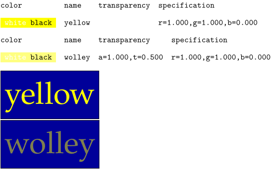 \showcolorcomponents [yellow] \blank \definecolor [wolley] [\colorcomponents{yellow},t=0.5,a=1] \showcolorcomponents [wolley] \blank \setupbodyfont[palatino,30pt] \framed[background=color,backgroundcolor=darkblue,foregroundcolor=yellow]{yellow} \framed[background=color,backgroundcolor=darkblue,foregroundcolor=wolley]{wolley}