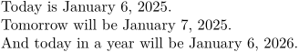 Today is \currentdate. \increment\normalday Tomorrow will be \currentdate. \decrement\normalday %\increment\normalmonth% -- gives an error as of 08-2023 \increment\normalyear And today in a year will be \currentdate.