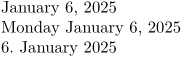 \currentdate \currentdate[weekday,month,day,{, },year] \currentdate[day,{.~},month,{~},year]