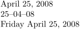 \date[d=25,m=4,y=2008] \par \date[d=25,m=4,y=2008][dd,--,mm,--,yy] \par \date[d=25,m=4,y=2008][weekday,month,day,{,~},year] \par