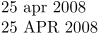 \date[d=25,m=4,y=2008][day,~,month:mnem,~,year] \par \date[d=25,m=4,y=2008][day,~,MONTH:mnem,~,year]