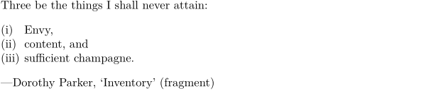 \defineconversion[bracketroman][(\romannumerals] Three be the things I shall never attain: \startitemize[bracketroman, packed][stopper=), width=2em] \item Envy, \item content, and \item sufficient champagne. \stopitemize \leftaligned{---Dorothy Parker, \quote{Inventory} (fragment)}
