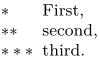 \defineconversion[starred][\m{*},\m{**},\m{***}] % Math mode gives better spacing, thus \m{...} \startitemize[starred,packed][stopper=,width=2.5em] \item First, \item second, \item third. \stopitemize