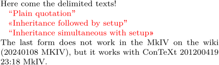 % mode=mkiv \setuppapersize[A6] Here come the delimited texts! \setupquotation[color=red] \startquotation Plain quotation \stopquotation % Definition inherits, followed by setting up \definedelimitedtext[qone][quotation] \setupdelimitedtext[qone][left=«] \startqone Inheritance followed by setup \stopqone % Definition inherits and sets up all in one step \definedelimitedtext[qtwo][quotation][right=»] \startqtwo Inheritance simultaneous with setup \stopqtwo The last form does not work in the MkIV on the wiki (\contextversionnumber), but it works with ConTeXt 201200419 23:18 MkIV.