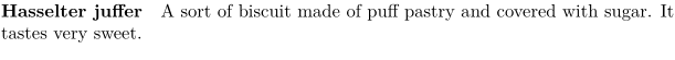 \definedescription [concept] [alternative=serried, headstyle=bold, width=broad] \concept{Hasselter juffer} A sort of biscuit made of puff pastry and covered with sugar. It tastes very sweet. \par