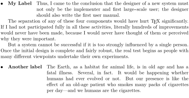 \definedescription[T] [headstyle=bold, width=fit, % Width of the running text indenting={yes,medium}, % (Internal) indenting of the running text text={\hbox to1.5em{$\bullet$}}, % Put in the front of each label hang=5, % Revert indenting after 5 lines ] \startTEXpage \startT{My Label} \input knuth \stopT \T{Another label} \input ward \stopTEXpage