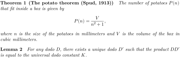 % by Mikael Sundqvist, 2023-05 \defineenumeration[Theorem] \setupenumeration[Theorem] [alternative=serried, title=yes, way=bychapter, prefix=chapter, width=fit, style=\it,] % Lemma inherits all properties from Theorem and just overrides the name: \defineenumeration[Lemma][Theorem][text=Lemma] \startTheorem[title={The potato theorem (Spud, 1913)}] The number of potatoes \im{P(n)} that fit inside a box is given by \startformula P(n) = \frac{ V }{ n^2 + 1 }, \stopformula where \im{n} is the size of the potatoes in millimeters and \im{V} is the volume of the box in cubic millimeters. \stopTheorem \startLemma For any dodo \im{D}, there exists a unique dodo \im{D'} such that the product \im{DD'} is equal to the universal dodo constant \im{K}. \stopLemma