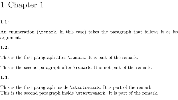 \chapter[chpt1]{Chapter 1} \defineenumeration[remark] [location=left,left={\in[chpt1]}.,right=:,width=0.3in,distance=0.02in,text=] \remark An enumeration (\tex{remark}, in this case) takes the paragraph that follows it as its argument. \remark This is the first paragraph after \tex{remark}. It is part of the remark. This is the second paragraph after \tex{remark}. It is not part of the remark. \startremark This is the first paragraph inside \tex{startremark}. It is part of the remark. This is the second paragraph inside \tex{startremark}. It is part of the remark. \stopremark