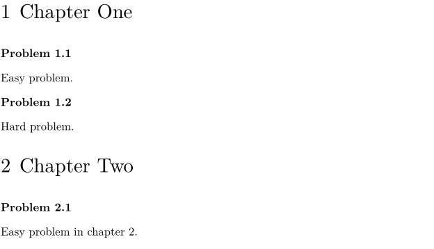 \setuphead[chapter][page=no] % to fit example on one page \defineenumeration[problem][way=bychapter, prefix=chapter, text=Problem] \chapter{Chapter One} \startproblem Easy problem. \stopproblem \startproblem Hard problem. \stopproblem \chapter{Chapter Two} \startproblem Easy problem in chapter 2. \stopproblem