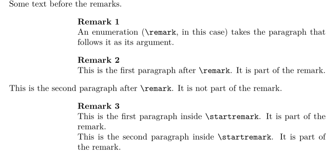 \setupindenting[yes,small,first] \defineenumeration[remark] [alternative=top, text=Remark, inbetween={\blank[nowhite]}, after=\blank, headstyle=bold, margin=1in,] Some text before the remarks. \remark An enumeration (\tex{remark}, in this case) takes the paragraph that follows it as its argument. \remark This is the first paragraph after \tex{remark}. It is part of the remark. This is the second paragraph after \tex{remark}. It is not part of the remark. \startremark This is the first paragraph inside \tex{startremark}. It is part of the remark. This is the second paragraph inside \tex{startremark}. It is part of the remark. \stopremark
