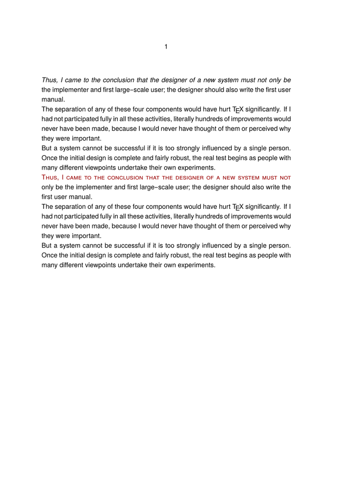 \setupbodyfont [heros] %% important: smallcaps capable font! \definefirstline [italicfirstline] [ alternative=line, style=italic, ] \definefirstline [smallcapsfirstline] [ alternative=line, color=darkred, style=smallcaps, ] \starttext \setfirstline[italicfirstline] \input knuth \par \setfirstline[smallcapsfirstline] \input knuth \par \stoptext