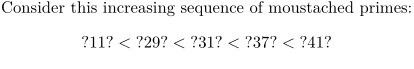 \definefontfallback [xits-fallback] [file:xits-math.otf] [023B0,023B1] \definefontsynonym [MathRoman] [modern] [fallbacks=xits-fallback] Consider this increasing sequence of moustached primes: \startformula \lmoustache 11 \rmoustache < \lmoustache 29 \rmoustache < \lmoustache 31 \rmoustache < \lmoustache 37 \rmoustache < \lmoustache 41 \rmoustache \stopformula