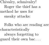 % define, then set up \definelines[evenly] \setuplines[evenly][indenting={yes, 1em, even}] % define with setup \definelines[oddly][indenting={yes, 1em, odd}] \startevenly Chivalry, schmivalry! Roger the thief has a method he uses for sneaky attacks:% Comment out last newline \stopevenly \startoddly Folks who are reading are characteristically always forgetting to guard their own bac\unknown% Comment out last newline \stopoddly