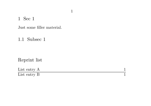 \setuppapersize[A7,landscape] \definelist[Reprints][criterium=all,alternative=b] \starttext \section{Sec 1} Just some filler material. \writetolist[Reprints]{1.}{List entry A} \subsection{Subsec 1} \writebetweenlist[Reprints][location=here]{\hrule} \writetolist[Reprints]{2.}{List entry B} \subject{Reprint list} \placelist[Reprints] \stoptext