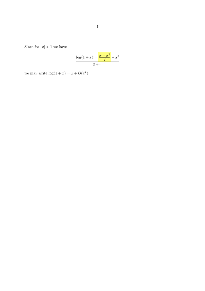 \setuppapersize[A5] \definemathframed[graymath] [ frame=off, location=mathematics, background=color, backgroundcolor=lightyellow, backgroundoffset=1pt ] \starttext Since for $|x| < 1$ we have \startformula \log(1+x) = \graymath{x- \displaystyle{x^2\over2}} + {x^3 \over 3} + \cdots \stopformula we may write $\log(1+x) = x + O(x^2)$. \stoptext