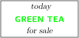\setupcolors[state=start] \defineoverlay[tea][{\green\ss\bf GREEN TEA}] \framed[ background=tea, align={middle,hilo}, width=.25tw, ]{ \em today \blank[2*big] for sale }