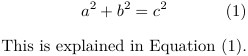\definereferenceformat [ineq] [left=(, right=), text=Equation~,] \placeformula[eq:pythagoras] \startformula a^2+b^2=c^2 \stopformula This is explained in \ineq[eq:pythagoras].