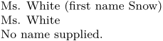 % This command accepts two optional arguments \def\writename% {\dodoublegroupempty \dowritename} % This command looks at how many non-empty arguments % are supplied, and acts accordingly \def\dowritename#1#2% {\ifsecondargument Ms. #2 (first name #1)% \else\iffirstargument Ms. #1% \else No name supplied.% \fi\fi} \writename{Snow}{White} \par \writename{White} \par \writename
