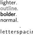 \ss\tfa \effect[inner]{lighter}.\\ \effect[outer]{outline}.\\ \effect[both]{bolder}.\\ \effect[normal]{normal}.\\ \effect[hidden]{invisible}.\\ \effect[stretch]{letterspacing}.