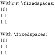 Without \tex{fixedspaces}:\crlf 101\crlf 1~1\crlf 1 1\crlf \fixedspaces With \tex{fixedspaces}:\crlf 101\crlf 1~1\crlf 1 1