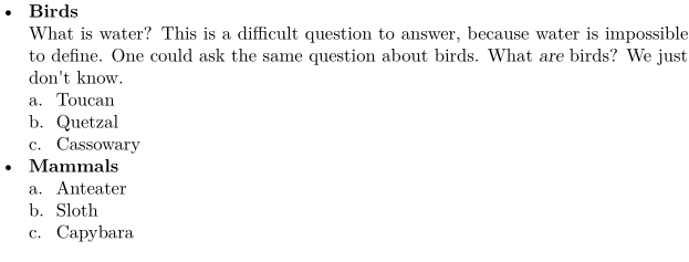 \startitemize[packed][headstyle=bold] \head Birds \par What is water? This is a difficult question to answer, because water is impossible to define. One could ask the same question about birds. What {\em are} birds? We just don't know. \startitemize[a] \item Toucan \item Quetzal \item Cassowary \stopitemize \head Mammals \par \startitemize[continue] \item Anteater \item Sloth \item Capybara \stopitemize \stopitemize