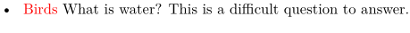 \startitemize[packed, headintext][headcolor=red] \starthead{Birds} What is water? This is a difficult question to answer. \stophead \stopitemize