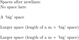 Spaces after newlines: \\ \hspace[big] No space here \\ \vphantom{m}\hspace[big] A ‘big’ space \\ \phantom{m}\hspace[big] Larger space (length of a m + ‘big’ space) \\ \hphantom{m}\hspace[big] Larger space (length of a m + ‘big’ space)