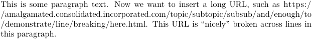 \setupinteraction[state=start,color=green,style=bold] This is some paragraph text. Now we want to insert a long URL, such as \hyphenatedurl{https://amalgamated.consolidated.incorporated.com/topic/subtopic/subsub/and/enough/to/demonstrate/line/breaking/here.html}. This URL is \quotation{nicely} broken across lines in this paragraph.