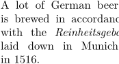 \setuppapersize[A9] \hyphenation{ac-cord-ance Rein-heits-gebot} A lot of German beer is brewed in accordance with the {\it Reinheitsgebot} laid down in Munich in 1516.
