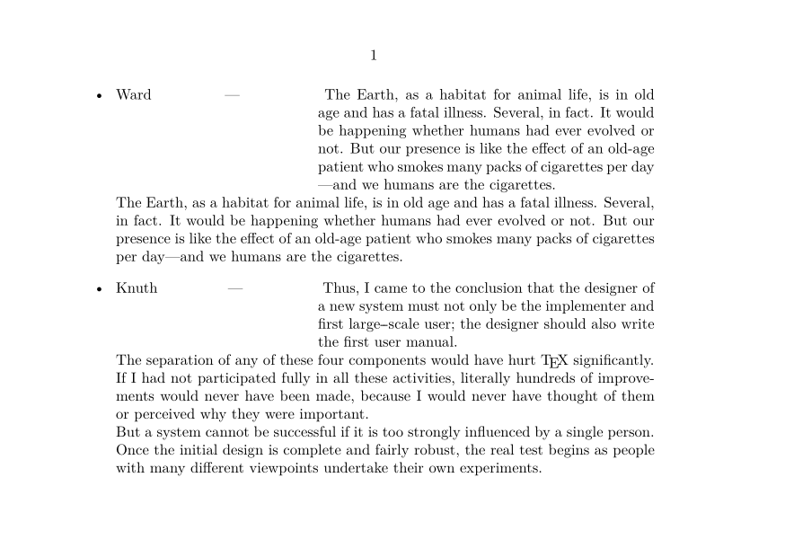 \setuppapersize[A6,landscape] \define[1]\ItemCommand {\hangindent=1.5in \freezeparagraphproperties % needs a fairly new ConTeXt (mid-2021) \simplealignedbox{1.5in}{flushleft}{#1\hss--- } \ignorespaces} \setupitemize[command=\ItemCommand] \starttext \startitemize \item{Ward} \input ward \input ward \item{Knuth} \input knuth \stopitemize \stoptext