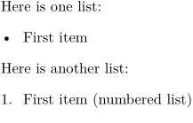 Here is one list: \startitemize \item First item \stopitemize Here is another list: \startitemize[n] \item First item (numbered list) \stopitemize