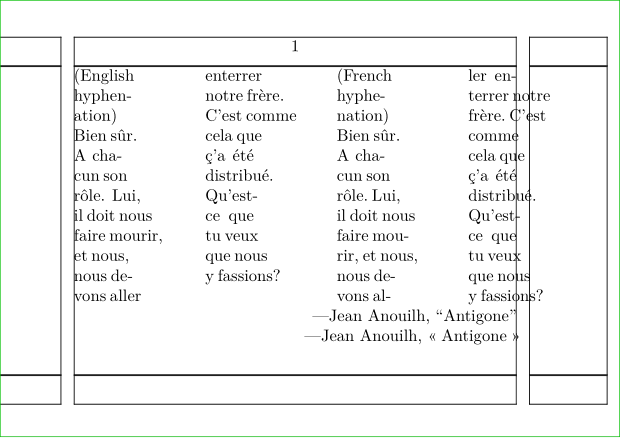 \setuppapersize[A7,landscape] \showframe \starttext \startsimplecolumns[n=4, distance=5em] (English hyphenation) Bien sûr. A chacun son rôle. Lui, il doit nous faire mourir, et nous, nous devons aller enterrer notre frère. C’est comme cela que ç’a été distribué. Qu’est-ce que tu veux que nous y fassions? \column \language[fr] % or [french] (French hyphenation) Bien sûr. A chacun son rôle. Lui, il doit nous faire mourir, et nous, nous devons aller enterrer notre frère. C’est comme cela que ç’a été distribué. Qu’est-ce que tu veux que nous y fassions? \stopsimplecolumns \language[en] \rightaligned{—Jean Anouilh, \quotation{Antigone}}\crlf \language[fr] \rightaligned{—Jean Anouilh, \quotation{Antigone}} \stoptext