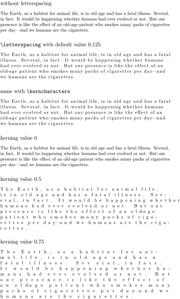 \setupalign[flushleft] \subject{without letterspacing} \samplefile{ward} \subject{\tex{letterspacing} with default value 0.125} \letterspacing{\samplefile{ward}} \subject{same with \tex{kerncharacters}} \kerncharacters{\samplefile{ward}} \subject{kerning value 0} \letterspacing[0]{\samplefile{ward}} \subject{kerning value 0.5} \letterspacing[0.5]{\samplefile{ward}} \subject{kerning value 0.75} \letterspacing[.75]{\samplefile{ward}}