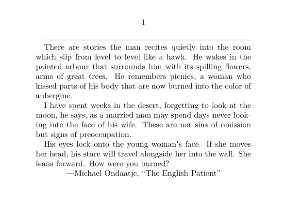 \setuppapersize[A7,landscape] \setupindenting[yes, small] \starttext \hairline There are stories the man recites quietly into the room which slip from level to level like a hawk. He wakes in the painted arbour that surrounds him with its spilling flowers, arms of great trees. He remembers picnics, a woman who kissed parts of his body that are now burned into the color of aubergine. I have spent weeks in the desert, forgetting to look at the moon, he says, as a married man may spend days never looking into the face of his wife. These are not sins of omission but signs of preoccupation. His eyes lock onto the young woman's face. If she moves her head, his stare will travel alongside her into the wall. She leans forward. How were you burned? \midaligned{---Michael Ondaatje, \quotation{The English Patient}} \stoptext