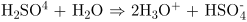 \molecule{H_2SO^4} + \molecule{H_2O} \Rightarrow\ 2\molecule{H_3O^+} + \molecule{HSO_4^{-}}