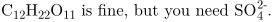 \molecule{C_12H_22O_11} is fine, but you need \molecule{SO_4^{2-}}.