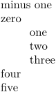 minus one\par zero\par \setupindenting[yes, 20pt] one\par two\par three\par \noindenting four\par five\par