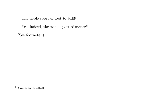 \setuppapersize[A7,landscape] \starttext \setupwhitespace[big] ---The noble sport of foot-to-ball!\footnote[fn:fball]{Association Football} ---Yes, indeed, the noble sport of soccer!\note[fn:fball] (See footnote.\high{\tfxx \in[fn:fball]}) \stoptext