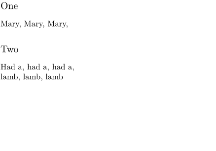 \setuppapersize[A10, landscape][A8, landscape] \setuppagenumbering[alternative=singlesided, location={header,inright}] \setuppaper[nx=2, ny=2] \setuparranging[XY] \showframe[cut=true] \subject{One} Mary, Mary, Mary, \page[odd] \subject{Two} Had a, had a, had a, \page[yes] lamb, lamb, lamb