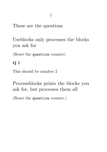 \setuppapersize[A7] \starttext \defineblock[question] \defineenumeration[Q][text=Q] \subject{These are the questions} \beginquestion[first] \Q This should be number 1 \endquestion \beginquestion[last] \Q This should be number 2 \endquestion \subject{Useblocks only processes the blocks you ask for} (Reset the \type{question} counter) \resetQ \useblocks[question][last] \subject{Processblocks prints the blocks you ask for, but processes them all} (Reset the \type{question} counter.) \resetQ \processblocks[question][last] \stoptext