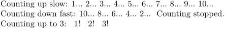 Counting up slow: \dorecurse{10} {\recurselevel...\ } Counting down fast: \dostepwiserecurse{10}{1}{-2} {\recurselevel...\ } Counting stopped. Counting up to 3: \doloop{ \ifnum \recurselevel=3 \exitloop % exit at end of current iteration \fi \recurselevel! }