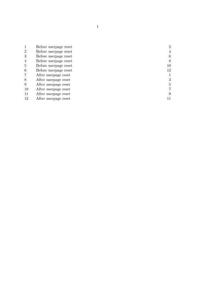 \usemodule[ipsum] \starttext \placecontent \pagebreak \dorecurse{6}{\section{Before userpage reset} \dorecurse{6}{\ipsum}\pagebreak} \resetuserpagenumber \dorecurse{6}{\section{After userpage reset} \dorecurse{6}{\ipsum}\pagebreak} \stoptext